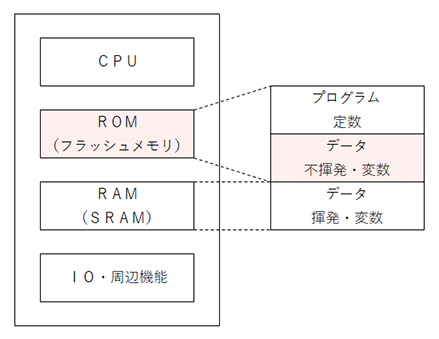 MCU内のメモリはおもにプログラムを保存する ROMと 変数を保存する RAMがあります。ROMは電源の供給がなくても記憶が保存されます。RAMは電源の供給がなくなると記憶は消えます。